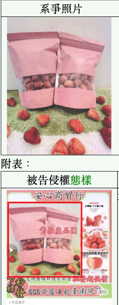 第一案是草莓凍乾的商品照。原告將商品居中擺放、前方陳設數顆凍乾、下方鋪設綠白相間桌墊,由正前方拍攝。法院認定這些都不算「特殊」的選擇及調整——但「特殊」這個門檻從何而來?大前提只要求「有所選擇及調整」,到了涵攝卻變成要「特殊」的選擇及調整,標準無聲地升高了。更弔詭的是,場景佈置、配色搭配、拍攝位置的選定,這些法院用來否定創作性的事實,本身不就是「對構圖有所選擇及調整」的具體表現?